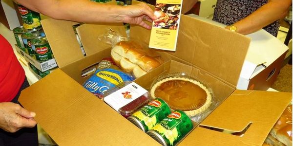 Working together with Publix Super Markets, Inc., holiday dinners are prepared and boxed for pickup. The meals consist of a complete Thanksgiving feast including turkey, stuffing, mashed potatoes, gravy, vegetables, and dessert.